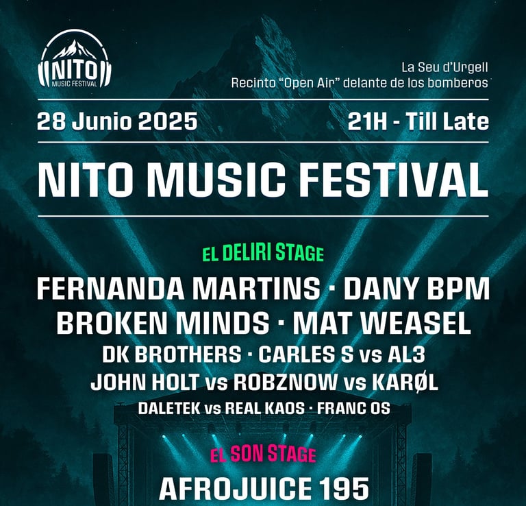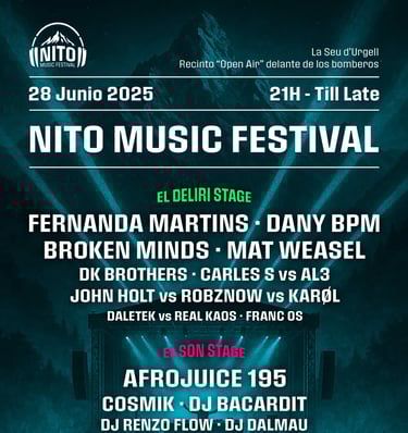 NITO es más que un festival: es una declaración de intenciones. Queremos posicionarlo como el gran evento de música electrónica de referencia en la capital del Alt Urgell, uniendo fuerzas locales y talento internacional para ofrecer una experiencia única, con una producción técnica a la altura de los grandes festivales del país.